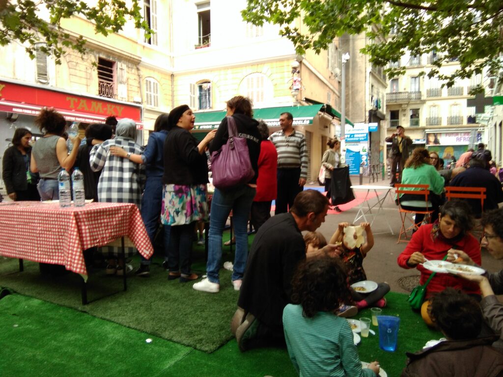 Ale to hlavní překvapení na mě teprve čekalo. Z ničeho nic se přede mnou otevřelo náměstíčko, na kterém byl v plném proudu arabský piknik. Uprostřed náměstí byly stoly s dobrotami, na zemi byly rozložené deky, na nich posedávali lidé a jedli tabouleh, chalvu a popíjeli čaj. Zvědavě jsem se tam vydala, cvakla pár fotek a chtěla zase jít, když v tom se z davu vytvořil Japonec, zatáhl mě k jednomu ze stolů a přinesl mi tabouleh a pár sladkostí. Tím jsem se stala součástí sousedské sešlosti.