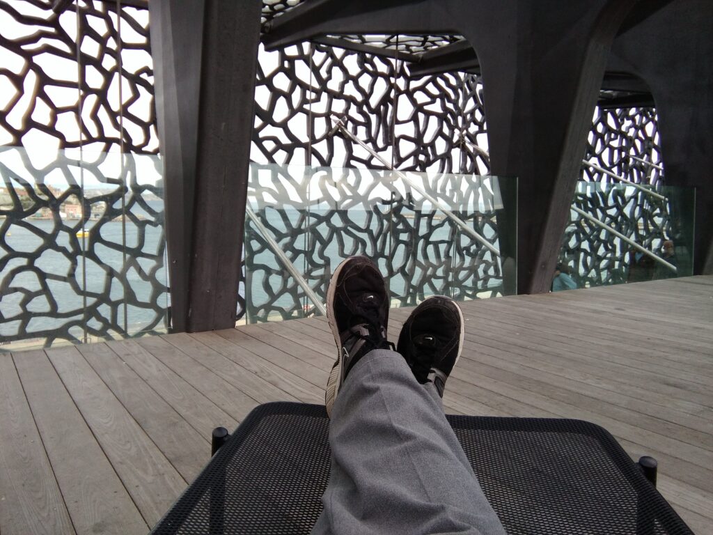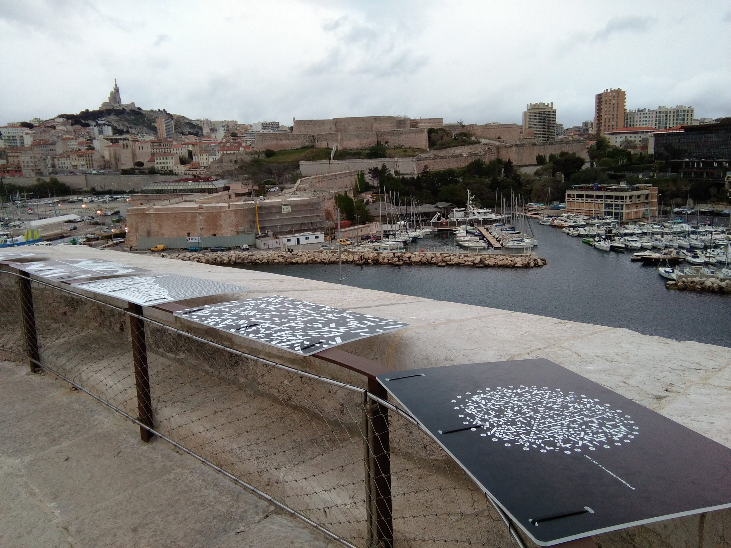Cesta vedla nejdřív do přístavu, kde jsem narazila na další trhy, tentokrát farmářské. Koupila jsem si tričko s obrázkem Marseille a levandulové mýdlo a zamířila jsem k pevnosti Fort Saint Jean a muzeu MUCEM. MUCEM je architektonicky zajímavá budova, betonová kostka s pláštěm z kovového krajkoví. Zeshora skrz něj můžete pozorovat obzor a moře. Ze střechy muzea pak vede lávka, která ho spojuje s historickou pevností. Moderní a staré tu tvoří zajímavý celek.